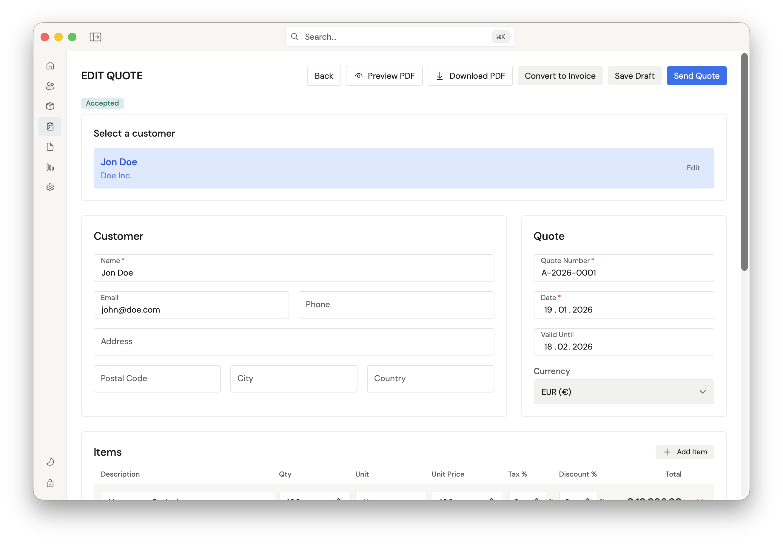 Professionelle Rechnungssoftware für Freiberufler und kleine Unternehmen. Funktioniert offline, bleibt privat.
